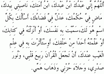 Ya Allah, sesungguhnya aku adalah hambaMu, anak kepada hambaMu, anak kepada hamba perempuanMu, ubun-ubunku di tanganMu, terlaksana ke atasku hukumanMu dan adil kehakimanMu terhadapku, aku memohon kepadaMu dengan setiap nama yang Engkau namakan dengannya diriMu, atau Engkau turunkan di dalam kitabMu, atau Engkau telah mengajarnya kepada seseorang daripada makhlukMu atau yang tersembunyi pada ilmu ghaib di sisiMu, jadikanlah Al-Quran penenang hatiku, cahaya di dadaku, penghapus kedukaanku dan penghilang kesusahanku.