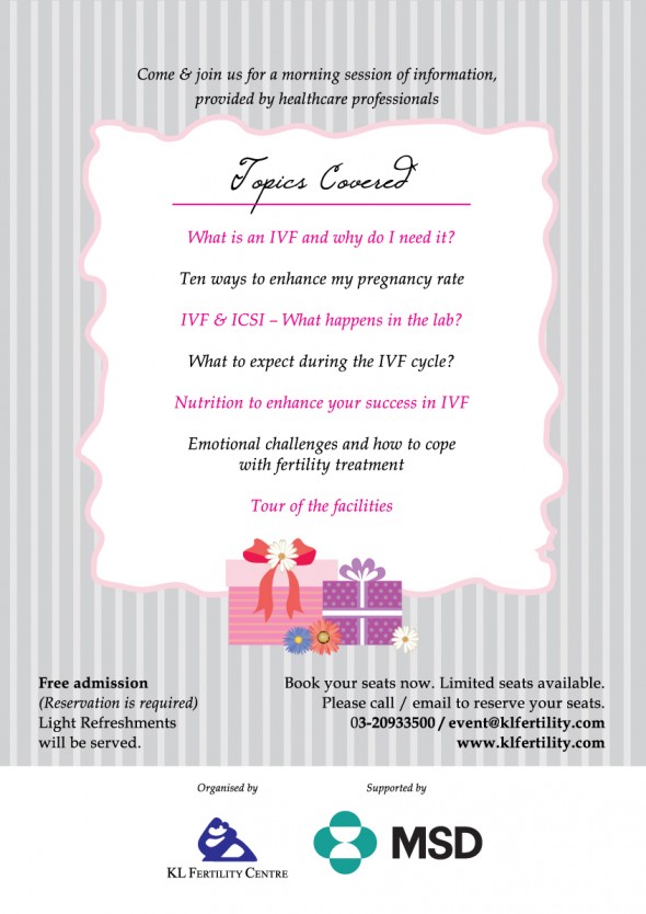 Bagi semua pasangan TTC, KL Fertility Centre akan mengadakan Seminar IVF pada 24 May 2014. Bagi pasangan yang ingin mengetahui dengan lebih lanjut lagi mengenai prosedur IVF ini digalakkan untuk menghadiri seminar percuma ini. Pihak KL Fertility Centre juga akan memberikan diskaun istimewa bagi IVF package mereka pada hari tersebut.